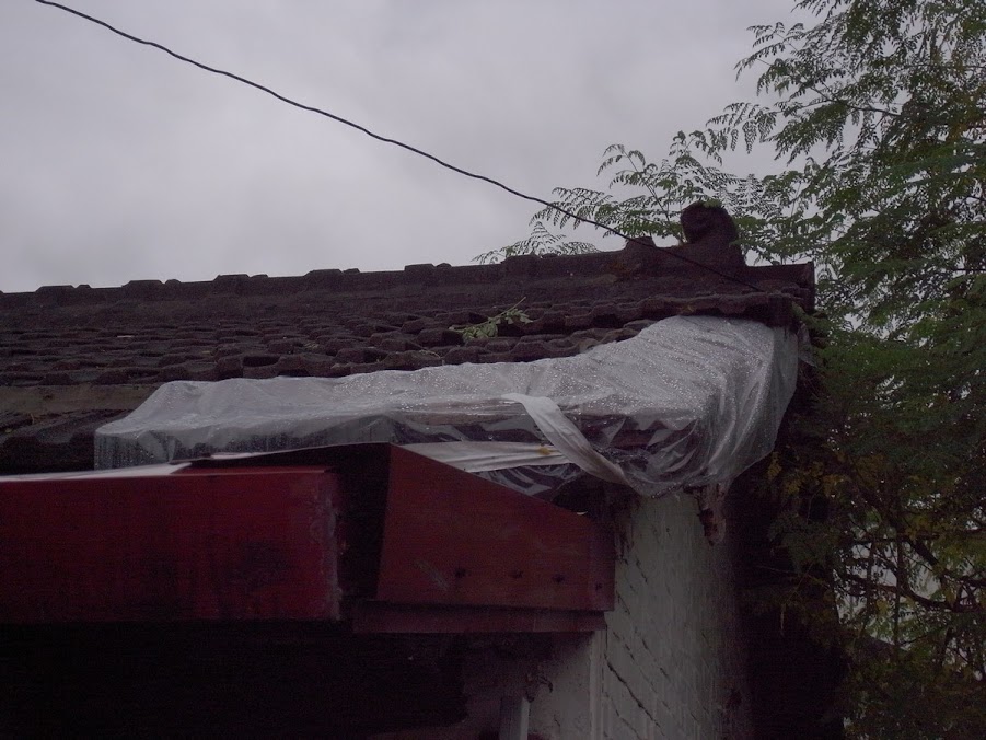 鋪上塑膠布,蓋回瓦片,讓塑膠布把整片水泥蓋住,角落的地方用膠帶黏起來避免大風把塑膠布掀開,這樣屋頂的修繕就順利的完成了。