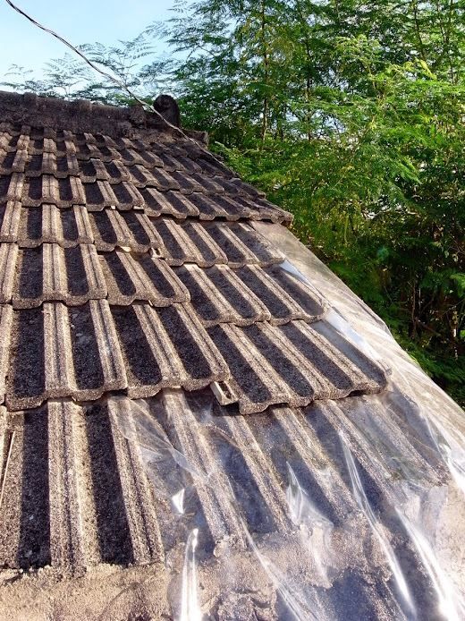 鋪上塑膠布,蓋回瓦片,讓塑膠布把整片水泥蓋住,角落的地方用膠帶黏起來避免大風把塑膠布掀開,這樣屋頂的修繕就順利的完成了。