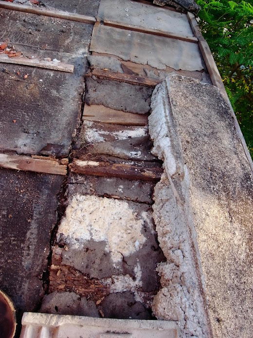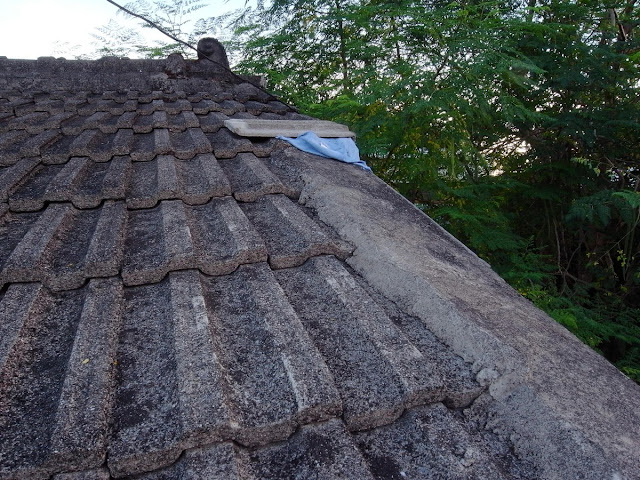 客廳的屋頂修繕難度其實很高,而且認真說起來,之所以會漏水很大一部分的理由是因為之前屋主的不當修繕;我不知道是為了什麼原因,但是客廳屋頂角落的一段瓦片都被水泥取代了;颱風過後我上屋頂觀察,發現雨水順著瓦片一路往下流,一直流到跟水泥交接的地方;原本雨水應該繼續順著水泥的表面往下流的,但是因為年代久遠,風吹雨打日曬的結果,水泥與瓦片交接的地方已經斷裂出一條細縫,雨水就是順著這一條細縫流進瓦片下,再慢慢的滲透進屋內來的。